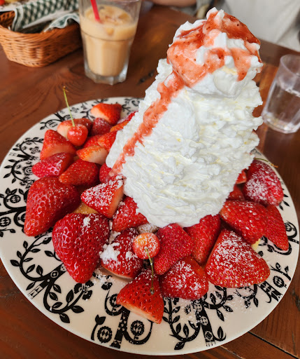 生クリームはさっぱりしていて、パクパク食べ進められるけどパンケーキも熱いし気温も暑いで下の方は結構すぐとけちゃう。 いちごはさすが、 いちご狩りしてるだけあっておいしい!!しかもさくらんぼものってる!!3粒!! 私はさくらんぼの亡霊(さくらんぼ狩りしたかったけど前日に知ったので予約しそびれた)だったので歓喜、テンションあがりまくり。こちらもおいしい。 ウキウキで食べ進めていくもパンケーキの登場が遅い。どれだけいちごをたべもまだか?まだか?と全貌はなかなか見えてこない。