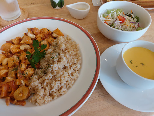スープは、カボチャに見えたが、いも?なにかわからず不思議な味。メインの料理は雑穀米かタイ米のようなパサパサした感じに不味いふりかけをかけた感じ。 ヤコブさんというオーブン煮込み料理と書かれていた、写真がないのでイメージ沸かず。煮物にむね肉なので固くて、かしゅなっつやバナナの甘味があり複雑な味。こういう味が好きな人は良いけど、久しぶり外食で口に合わなかった。 男性はちょっと苦手だと思う。