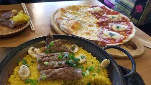 Real DELICIOUS NY style pizza! I'm from NYC so, I'm impressed that this place really knows how to make it! Thin crust, tasty toppings...traditional and un-traditional. Great smoothie too! Not loaded with sugar. Big fresh salads. And really great prices! Friendly and welcoming and attentive waitstaff. Not a long wait for order.Very comfortable environment. Will go again to try their diverse menu...curry, tacos, grill, doria, paella...