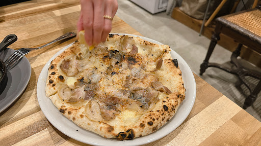 その後はピザを3枚オーダー。 どのピザも甲乙つけがたい美味しさでしたが、中でも印象的だったのが“ボルケッタ”という豚バラ肉のハーブローストが乗ったピザ。 ふわふわでもちもちの生地の上に、ジューシーで香ばしい豚バラがたっぷりと乗っていて、食べるごとにハーブの香りが広がります。これは本当に絶品。