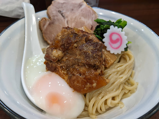 鶏塩が人気のようですが、暑い日だったのでつけ麺を選択。 チャーシューに加えてトロコリ肉という豚軟骨の煮込みがのっててボリュームあります。また、卵がゆで卵ではなく温泉卵という特徴的なトッピングたちです。 トロコリ肉はもっと熱々だとより美味しいのかなぁという感じ。玉子は、私は普通のゆで卵の方が好みです。