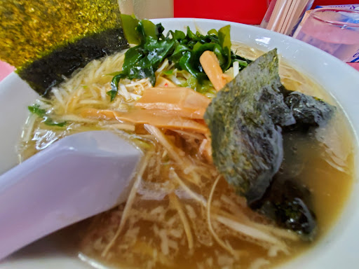 Read more2024/05/08(水)13:00頃訪問。 ラーメンショップ間々田店 駐車場は、店舗から少し離れた場所にあり、10台程駐車可能。 訪問時、半分埋まっていました。 店内席は、カウンター7席・テーブル席(4人掛)1卓のみ。 店主さんと奥様でしょうか?お二人で営業しており、来客多く、次々来るお客さんを入口入る前から確認していて店内回転良く営業しています。 ネギラーメン(890円)とライス(100)円を注文。 狭い店内の為、カウンターに座るとラーメンを作る様子が伺え、期待も膨らむ。手際よく作られたラーメンがあっという間にテーブルに。 細麺の上に細く切られ味付けされたネギ・メンマ・ワカメ・大きな海苔が盛り付けられ、スープは若干濃いめ。 店内メニュー下に記載された案内通りよく混ぜて、ラーメンを頂く。 柔らか麺とネギの食感バランス良く、濃いめの味付けの為、ご飯も合う。 たちまち完食し、残ったスープにテーブルに置かれた酢を入れて飲むと、スープも飲みやすくなりました。が、完食に至らず。 でも美味しかった。再訪した...