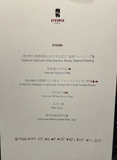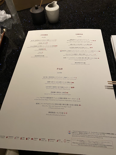 The hotel is located in a wonderful location (near lake yamanaka) with an amazing view of Mt Fuji. However, this is a review for the restaurant Oyama. If you come to this hotel, do not come for the food. The evening started off well with the appetizers being pretty good (grilled bamboo sesame green salad or an elevated potato salad with roe and poached egg - we got different sets), followed by a sea bream sashimi with seaweed in a dashi soy sauce. Then things just started to go downhill from there …. The shrimp was overcooked, making it very difficult to peel with no side dish to put the shells. Luckily the shrimp was fresh and didn’t need the yuzu mayonnaise it came with. Next came the grilled salmon or eel. The salmon was dry and fishy, while the eel was grilled and placed a plate with two sliced cucumbers (very uninspired, and nothing to be amazed about). Then we got to the meat course. My partner ordered the Fuji set and I ordered the Omika, his has wagyu and mine is a Japanese beef. We were both served the exact same thing and when we asked about it, they came back saying oh there’s no wagyu tonight. Our sets have a 4000 yen difference, why didn’t anyone inform us when we were ordering. This is very unprofessional and shocking for a luxury hotel. Finally the sushi course and all of the pieces were barely edible, omg I’ve had better grocery takeout sushi than this in America. If you made it this far, the dessert was meh and there was a gratuity and service charge.