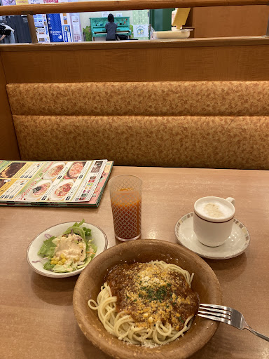仕事の休みが取れたのでゆっくりランチしました。 写真はミートソースボロニア風、ランチのオマケのサラダ、ドリンクバーの野菜ジュースとカプチーノです。