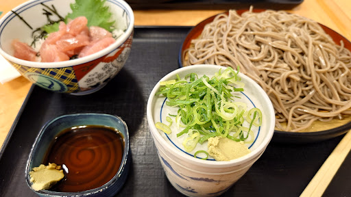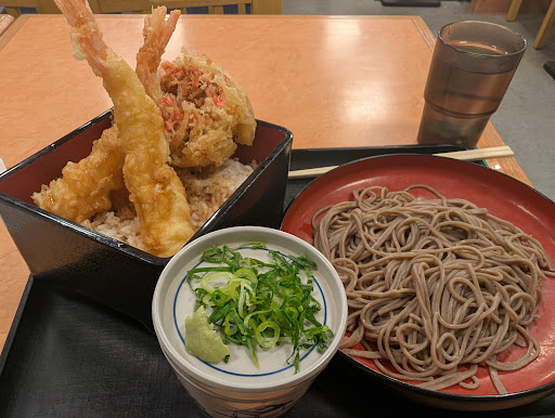 〇実食レポ ・天丼 天丼には単品、セットに小と並から選べます。 小は海老天1、かき揚げ1、ご飯小 並は海老天2、かき揚げ1、ご飯並 驚くべきはその値段で、小単品は500円を切る安さ。 ・かき揚げ ザクザク系で、小海老がたくさん乗っており、どこをかじっても海老の風味が広がります。メインは玉ねぎで仕上げられているので出汁と良く合います。 ・海老天 たまたまなのかデフォルトか不明ですが、衣が緩い。例えるならトロトロのたこ焼きの皮、生焼けのホットケーキミックス、そんな感じです。衣に若干の甘みを感じたので、ホットケーキミックスが適切な表現かもしれません。正直残念に感じました。もう少し火、入れたほうがいいと思います。 ・米 天タレをたっぷり吸い、天ぷらの油と相まって油っこくなってます。 ・蕎麦 北海道の蕎麦粉を使用しているようです。 田舎蕎麦のような太さとコシがあります。 個人差により、硬いと感じる方もいるかもしれません。私は好きな部類です。 薬味はネギとワサビ。一般的な好き嫌いの無い出汁だと思います。