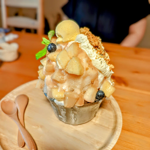 メニューに書かれていたのはこれだけやけど、 などの中身が凄かったです。 周りは桃のコンポートたっぷり 中にシャインマスカットがゴロゴロ これはもしかしたらその時その時期で違うのかも💡 ブルーベリーもみずみずしくて美味しかったです。 トップにバニラアイス、 底にはレモンのシャーベット(予想) 紅茶のシロップが真ん中位からたっぷりかけられてたのでレモンティーなお味でスッキリ美味しい。 めちゃくちゃ美味しいかき氷でした。