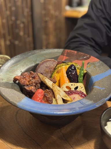【野菜】にんじん:あじぬけ、レンコン:素揚げでこれはうまい!、オクラ、なす:トロ甘でうまい!、煮込みキャベツ:ん~固いぞ・・・ズッキーニ:味しない、キクラゲ、冷たいゆで玉子。