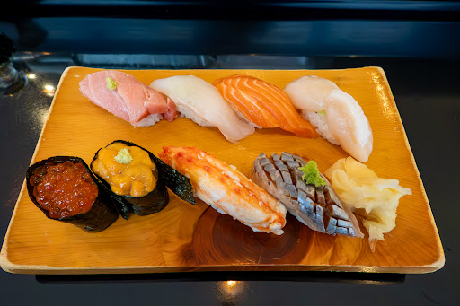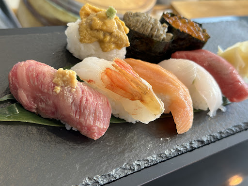 旬のおまかせ8カンを最初に注文し、次にお好みをお願いしました。どれも美味しかったのですが特に奥尻産の塩水ムラサキウニ、羅臼産の活つぶが美味しかったです。知床牛のトモサンカクはお代わりしちゃいました。 塩水ムラサキウニは海苔を巻いて軍艦にするとウニの味が海苔の味に負けてしまうのでウニの味を満喫できるようにと海苔がありません。