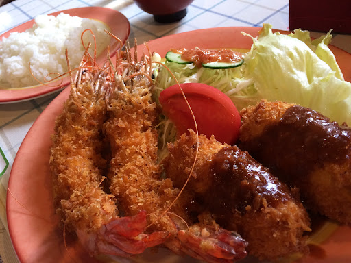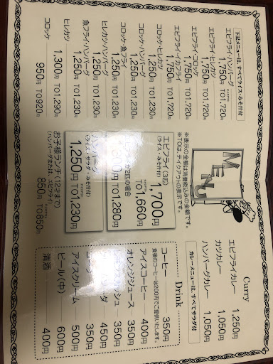 Read more11時開店ながら、時間前から既にお客が店の外で待っています。 休日の昼は電話予約不可。前もって店に行って予約するのは可能なのだとか・・・とにかくその位人気のあるお店です。 メニューで目に付くのはエビフライと、ハンバーグやヒレカツやクリームコロッケとの組み合わせですが、人気は大きなエビフライ。 通は「エビフライ3本」というやつを注文するようです。 ここのエビフライは確かに食べ応えがあっておいしい。クリームコロッケやハンバーグもそつなく旨いのですが、エビフライがあまりにも旨すぎて影が薄くなってしまいます。 ガッツリしたボリュームでどれも1500円。納得です。 カレーにもエビフライカレーというのがあります。定食と同じエビフライが2匹のっていてボリューム満点です。 カレーもキチンと美味しいです。強いて言えばハウスジャワカレー(中辛)のレ...