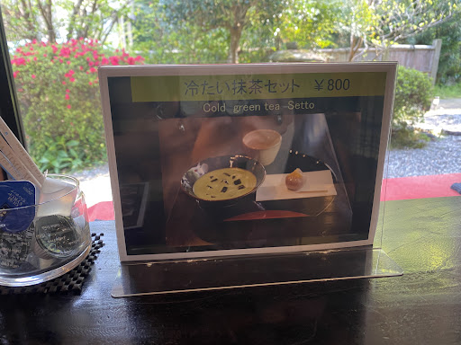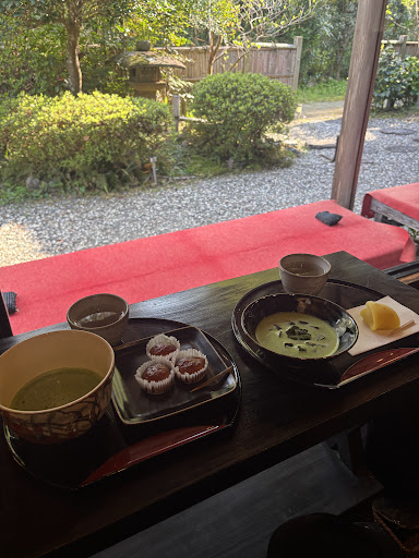 Super cute place! It was just us and two japanese grandmas there, you can tell the locals appreciate it. I had a matcha set with the brown sugar mochi balls, which were filled with custard and really delicious! The matcha was good too, and there is syrup provided if you like it a bit sweeter :) The third item in the set is a mysterious salt water, which wasn’t for me but my friend loved it. There’s even a small art store connected to the cafe, which was nice to look at. The view of the garden was beautiful, and it was a super peaceful little tea...
