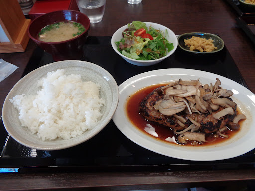 キノコハンバーグを頼みましたが、ハンバーグは程よい厚み&フワフワで美味しい!和風ソースとキノコの相性もとても良く、ご飯が進みすぎてオカワリしてしまいました。 野菜サラダも小さめにカットしてあり食べやすかったし、味噌汁も具多めで美味し。謎の小皿(生姜?の箸休め?)も好きな味でした。