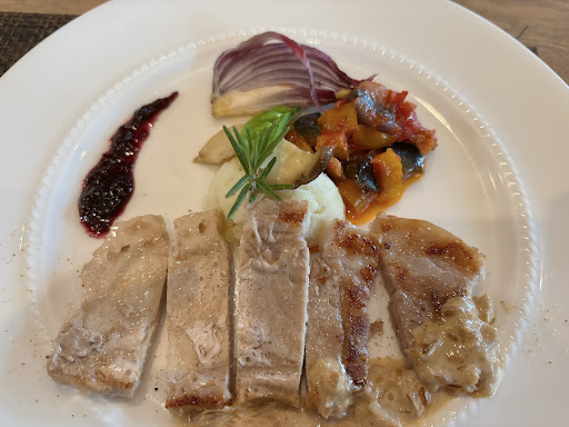🐟と🍖ランチ ブルーベリーのソースや、香りだかいソースが合っていて塩味は薄めかも。美味しいです
