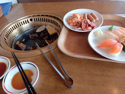 Read more5年ぶりの栗東店へ。ランチタイムで受付、店員は外国人でロボットのような接客。個人的にその方が気が楽。 メインの肉、硬いけど食べれない程ではない。卓上のタレで頂く。コーナーにレモン果汁が有り脂っぽい肉にはこれでさっぱりと頂ける。肉のアクなのか焼いた肉の炭なのか食べ進めるうちにレモン果汁が黒くなっていく。牛レバーが柔らかくて美味しかった。 寿司はマグロ、玉子、サーモン、光物、何かのマヨ軍艦、稲荷が有り、見た目は悪くないが、作り置きで酢飯が硬く、味は酢飯より白飯に近い。 サラダはキャベツ千切り、マカロニ、ポテサラ、レタス、ブロッコリー。そこそこ新鮮で良かった。キムチ、浅漬けも有り。 ホットコーナーは焼きそば、ナポリタン、唐揚げ、カレー、汁物が有る。どれも美味しかった。 デザートはプリン、コーヒーゼリー、オレンジゼリー、ケーキ2種類、果物(オレンジ、ライチ、缶詰パイン)アイス、ソフトクリーム。 麺類はうどん、ラーメン。セルフで調理。もやし、チャーシュー、青ネギの具が有り。 気になったのは衛生面、トングやディッシャーが食材の中に放置され汚れてた。焼肉用の味噌ダレの中にケーキが2個落ちてたのは客のモラルの問題?手洗い場所が入店して直ぐのゲームコーナーに1箇所だけ。ほとんどの客は手を洗わず、...