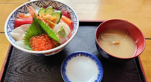 Read moreの海鮮丼(松)2000円。有頭ボタンエビ、ウニ、イクラ、マグロ、ホタテ、サーモン、イカ、蒸しエビ、あと名前の分からない白身魚がいくつか。台は酢飯で、きざみ海苔と椎茸甘煮が敷いてある。なかなか細工が込んでいて贅沢だ。お椀は地元産ナメコの味噌汁、これまたいい味が出ていて旨い。質も量も満足でした。