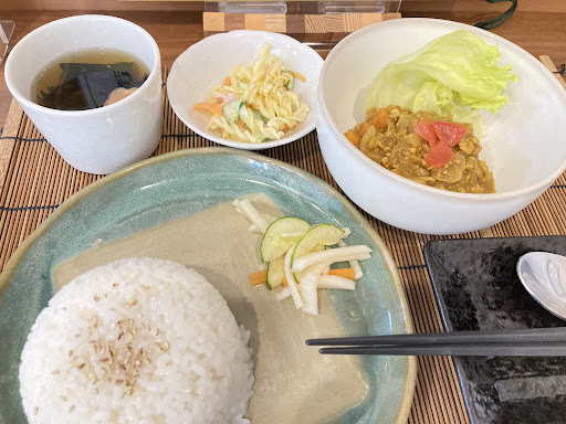 職場からも自宅からも比較的近いので時々ランチで伺います。 他のメニューも気になりつつ、なぜか毎回行くたびにこれを注文してしまうピリ辛ドライカレーのランチセット。 写真に写っているメイン料理と何種類か選べる小さめの甘味とコーヒー、紅茶、黒豆茶などの飲み物が付いてきます。