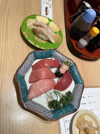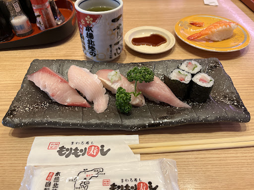 過去北陸へ旅行に行ったおり、金沢のもりもり寿司に行きましたが、あまりの待ち時間にあきらて、他の競合店に行った事があり、今回地元店ではないですが同じもりもり寿司だとお試しに入店しました。 多少の待ちがありましたが、ほどなく席に案内されました。他店同様にタブレットでのオーダー方式です。レーンにはワサビぐらいしか流れておらず、基本オーダー分のみが電車で運ばれてきます。