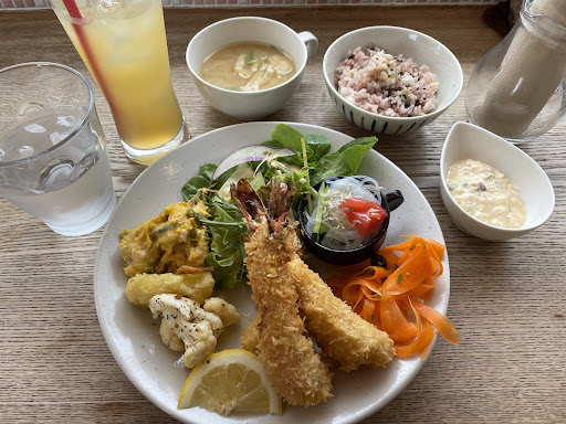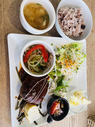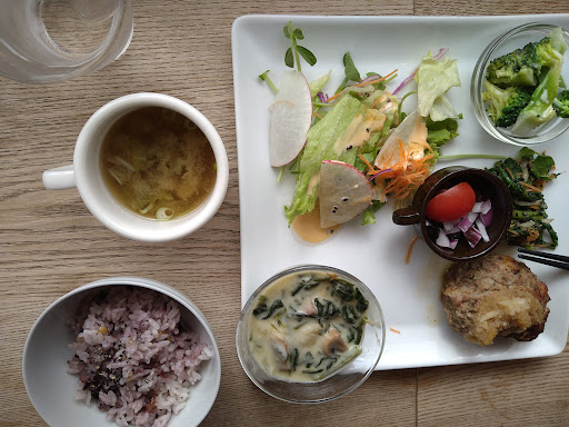 祝日にランチ利用しました。 外観から以前はコンビニだったことがわかります。 駐車場は店舗前に8台分ほどと路地を挟んで南側にある会社の駐車場に5台分。どこに停めても良いわけでなく コーンに表示があるので決められたスペースを利用してください。 店内は窓も広く明るい雰囲気です。 ソファ席とカウンター席があります。 訪問時はカウンターに案内されました。ソーシャルディスタンス保持のためか大きなパンダさんのぬいぐるみが真ん中に座ってました。 ランチはオーガニックな雰囲気のセットがボリュームに合わせて4種ほどと オムライスやロコモコなどの単品メニューも数種。 お腹に合わせて選べます。 おしゃべりに夢中でメニュー写真撮り忘れました。 選んだのはお値打ちな1000円のランチセット。 ハンバーグは手作りが伝わってくる柔らかさ。口に入れるとホロホロとほどけます。 玉ねぎや人参も刻まれて入っていて野菜の甘味とお肉の旨味が調和しています。 小さな器に盛り分けられたクリームシチューや豆のサラダも彩りよく美味しい味付けでした。 ご飯は雑穀米 お味噌汁は舞茸のお出汁がよく効いた優しく温かな味でした。 お客さんも多く 人気のお店のようです。 お店の方から「お客様が多いのでお料理の提供にお時間かかるかもしれません」と言われましたが そんなに待つこともなく出してもらえました。 手作り雑貨の販売もされているので興味のある方はそれも魅力かもしれません。 店内に飾られている小さな動物たちも(パンダは大きいけど)か...