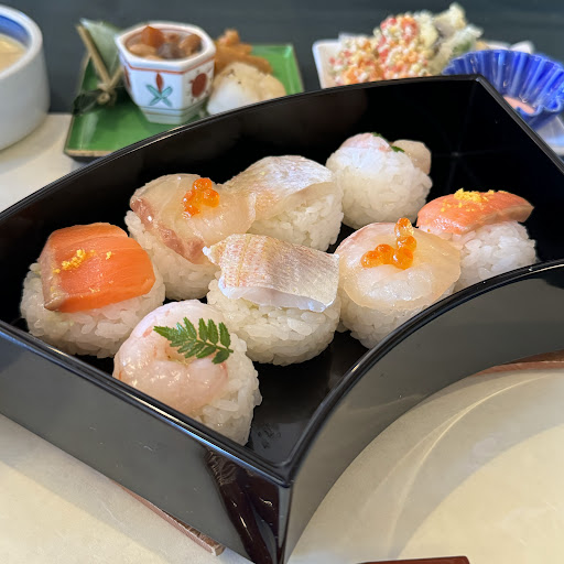 この日いただいたのは要予約というてまりランチ、てまり寿司4種8個に八寸・彩天麩羅・茶碗蒸しが入った3段観音箱、それにローストビーフ、味噌汁、旬のフルーツ、コーヒーが付いています。手まり寿司はサーモン、小鯛、甘エビなどでどれも安定していますね。