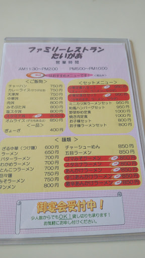 Read more何十年ぶりに来店しました。 〇ファミリーレストランと看板に書いてある。 〇店内は、中華料理屋のお店にある円卓もある。2人、4人がけテーブル席、小上がり席、ソファ席、小上がり席がある。佐渡の飲食店の中では 広めです。 〇メニューはご飯物、麺類、定食類がある。 〇今回は、スタミナ丼大盛を注文しました。 着丼した際、びっくりした!! 皿の大きさが大きい!! 自分の手よりもはるかにデカイ!! ゆっくり食べ始めて、なんとか完食することが出来ました。 ほかの気になるメニューもあるため、また来店したいです。 〇激辛あんかけラーメン 〇五目ラーメン 〇ガパオライス ...