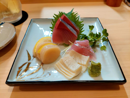 Read more2023年1月に出来た新しい寿司店。 新潟で修行したという店主と奥さんが切り盛り。L形のカウンター席が8席と半個室のテーブル席があります。瓶ビールと刺身盛合せ、本日のオススメのメジマグロのかま塩焼きをオーダー。刺身盛合せはメジマグロとアジ、クロカラの三種盛り。 お通しは自家製玉子豆腐。下に毛蟹が入っているそうです。刺身盛合せも新鮮、メジマグロのかま塩焼きも食べ応え十分。佐渡の地酒...
