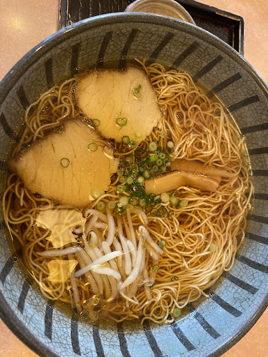 サラダは野菜がシャキシャキして美味しかったです ラーメンは京風と言う事で優しいスープです 麺は細麺、平麺が選べて店員さんに聞いたら細麺を頼む方が多いとの事で細麺にしました 細麺は素麺に似た感じでラーメンとして食べると少し物足りない感じでした 普段食べない系統のラーメンで美味しく頂きました