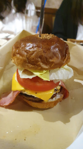 Read more2024.05初訪問。 星3つで「普通」の判定をするが、久々に星5つをつけたくなったハンバーガー屋さん兼居酒屋さん。 訪れた時間は24:30頃だったと記憶。 近所のBARがお客さんがいっぱいで入れなかった為、うろうろしていて見つけた。 この時間にも関わらず、カウンターは全席満員。テーブル席に案内される。お客さんたちは常連のようで、いかにお客さんに愛されている店かが伺える。 この日注文したのは「照焼きバーガー」とビール。 照焼きバーガーのバンズは、表面はカリッとしていて噛めば中はしっとりしている。挟まれたレタスもシャッキシャキで鮮度抜群だった。 パテも味が良かった。玉葱のスライスがあったが、よく火を通されていて玉葱嫌いの俺でも食べることが出来た。旨かった。 ビールを注文したが、ふと冷蔵庫を見ると「ゲームブリュー」のビールがある!!急いで注文し直してゲームブリューをいただきました。クラフトビールが飲めるなんて!これには特に感動。 支払いの時にふと見れば、棚にウイスキーやリキュール類が少々ある。 偶然見つけたお店だったが、飲み歩きのコースに加えよう。 いいお店を見つけてしまった。ラッキーだった。