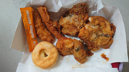 Read more駅前のケンタッキーが出来てから、そっちをよく使うようになりましたが、こちらの店舗は、他の店舗より揚がりすぎなのか、温め過ぎなのか、鶏肉の繊維がパサついてたり、衣がカッチコッチのときが結構あります。この前は、6ピースパックを買ったのに、全体の重量が4〜3ピースぐらいの貧弱なチキンしか入って無くて、これからはこちらの店舗では買い控えしようと思います。以前のレビューでも言いましたが、未だに店内は汚いので、店内で食事したいとは思いません。古い店...