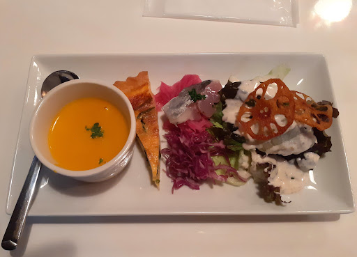 Read more初訪問。1500円のAランチを注文。 前菜(特にかぼちゃの冷製スープ)から美味い。よく調べずに訪問したがここのシェフは只者ではないのではなかろうか。 パスタ(90g)は茸とホタテの和風パスタ、妻は鶏肉とオクラのトマトソースパスタ。私が注文した和風パスタは風味よくスルスルと入っていく。妻も「このお店は美味しい」とかなりの高評価。 ボリューム的に少ないかなと思ったが前菜とあわせたら結果的には丁度良かった。 2200円のBランチはパスタが60gになるがメイン料理(肉or魚料理)が付くので満足度が更に高いかも。 ただしシェフ一人で調理、ホールもされてるので料理の提供に時間がかかるのが難点。 しかし時間に余裕のある人は同伴者とゆっくりと話をしながら料理を待つのも楽しみである。 ちなみに駐車場は石村萬盛堂横の路地入って50m程先にあります。 普段は辛口コメントが多い私も久々に満足しました。とても美味しかったで...
