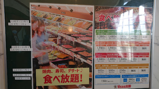 外出の昼食に焼き肉を食べたいと…近くだったので、主人と利用。 通常平日大人一人、焼き肉とお寿司食べ放題で1800円の処、65歳以上という事で1848円に。 ホルモンは大ぶりにカットされ美味しかったが、他の肉全てあまり美味しいとはいえない。お寿司は、品数も少なく味もイマイチ。食べ放題では、果物が一番原価が高いらしいと聞いているが…いちごや、りんご、パイナップル等は全く無く。冷凍のライチと、乾燥しかかったオレンジがメイン。サラダも酷かった。キャベツや、海藻は残り少なく、ブロッコリー、オクラ、トウモロコシ、玉ねぎ、ポテトサラダのみ…トマト、にんじん、レタス、アスパラ等全く無かった。フリードリンクは、大体何処も1人だけ注文出来ない(主人は、欲しいと言ったが、私は要らなかったので)ので、お茶と水になったが、お茶の機械が壊れている様で、粉茶に水(又は白湯)を入れてとなった…それが粉茶が固まっていて…他の焼肉店では、ビビンバ等有るがココは無くて、カレーか〜 サラダを入れる食器も使い古していて…あ〜ダメだこの店。ただ、一つモツ煮だけは、美味しかった。それだけで、又行くかと聞かれたら、無いですね。 店に入りレジにて注文。その場で支払いというのも初めてだった...