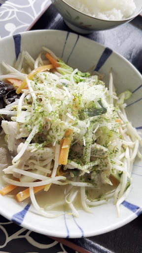 【もやし炒め定食】 塩ベースの野菜炒め。シャキシャキのもやしに、豚肉、キクラゲといった具材も織り込まれ、ご飯がすすむ。