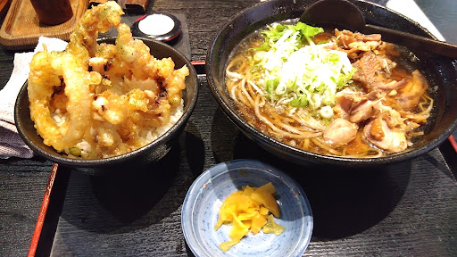Read more交通量の多い道路沿いのお店で駐車場は十分な量が準備されているため車が停められなくて困ることはなさそうです。 店内は靴を脱いで上がるタイプで一人用の席がきちんとあるのはうれしいですね。日曜でもやっている昼のランチセットがありがたいです。肉そばとえび天丼のセットを大盛で何度か注文しました。(1100円+200円)そばは太麺と細麺が選べますが太麺を選ぶと割りばしより太いものが出てきますので肉そばの場合は細麺の方が合うかと思います。自家製麺で表面がざらっとしたそばは細麺でもしっかりと存在感を感じます。甘めのスープとのバランスも良く高水準です。セットのえび天丼もエビ3本とカボチャなどの野菜とがふんだんに乗っておりお得感を感じます。ただ1回目の天丼のつゆがいささか甘すぎました。塩味を感じずほぼあまみだけでした。2回目の時は1回目ほど甘くなかったためブレがあるんですかね。2回目の時は甘めながらもきちんと塩味も感じたためおいしくいただきました。毎回これくらいだと誰にでもお勧めできるんですけどね。営業時間が11:30...