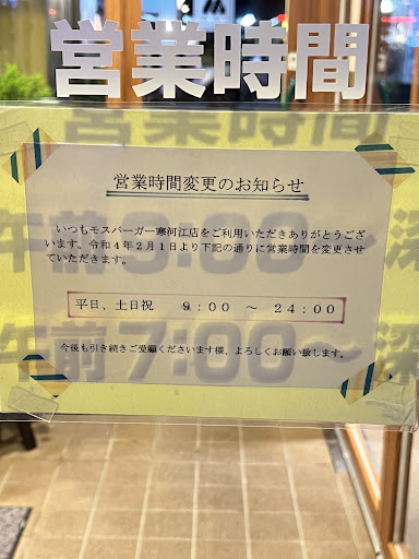 味は流石、モスバーガーさんだけ あって、文句なしに美味しい。 だが、店の雰囲気が暗すぎる。 山形市のほうのモスバーガーは 明るくて、若い客層のお客さんが 多く、賑わっている。内装などが 良いこともあるだろう。 だが、こちらの寒河江店を古くから 知る、地元民としては昔の明るさ、 客層と比べると、ガタ落ちしたかなあ と言わざるを得ない。 昔の華やかな明るさや、良い客層が 失われつつある。寒河江の話になるが、 マクドナルドさんに負けていると思う。 思い切って、内装を変えるなどの ことはできないものか? せっかくのモスバーガーの味があるのに、 雰囲気で客を逃してしまっている。 ドライブの際に注文するシステムで 店員がミスをするのは昔から指摘 されていた。そのへんも直すべき。 山形市のほうのモスバーガーは 完璧なだけに、こちらにも期待したい。 ここは思い出が多い場所なので、 頑張って欲しいという気持ちもある。 あと、店舗のほうに書くことでは ないかもしれないが、ドリンクの 種類をあと二つくらい、増やして ほしい。冷たいお茶系のメニューが...