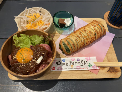 ランチではミニローストビーフ丼とサラダ、焼き立てパンのセットを注文。ローストビーフは柔らかく、食べ応え十分。そしてソースが絶品✨お肉なしで卵とこのソースでご飯を食べたいぐらいです。