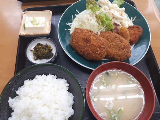 Read moreドライブ途中で16号線から立ち寄りました。 入り口が引き戸で入ってすぐに6卓程度のテーブルがありました。昔ながらの定食屋という感じで、往年のドラマの有名なシーンを思い出しました。 メニューも読んでわかる定食メニューが並びます。ふじやランチが気になり頼みました。 手作りコロッケ2つ、さつまいも?のフライ、ポテトサラダで1皿になっており、付け合わせが漬物、味噌汁、豆腐でとても美味しい。量も適量でした。 となりのテーブルの人のオムライスも気になりました。