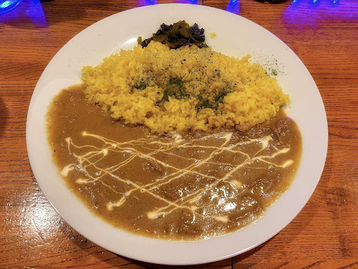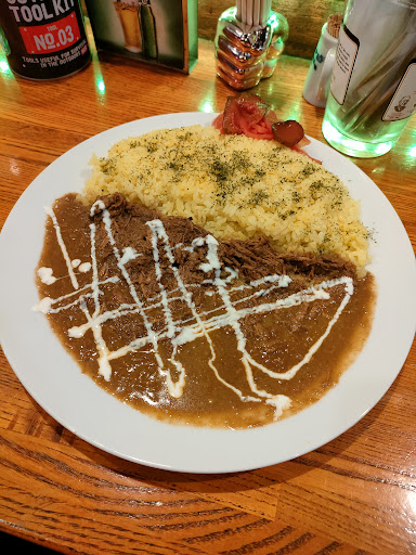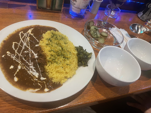 Read more彼女と呑んでホテルに帰る途中でこのお店を発見。 まだ飲み足りないし締めで何か食べたいので とりあえず入店。 店内には色々な物がディスプレイされていたがセンスがイマイチなのか古臭いのか ちょっと暗いイメージ。 とりあえずワインで乾杯🍷 あ、甘い❗️ 甘いお酒は気持ち悪くなるからダメなんです ビーフカレーを注文して二人で頂きます。 ターメリックライスがポイントですね。 ビーフは良く煮込まれていて原型があまり 無かったです。 カレーとしてはまぁ普通かな。 お勘定してホテルに帰って計算すると 金額が合わない。 チャージ取られてたのか? 安いワイン🍷に普通のカレー食って チャージ取...