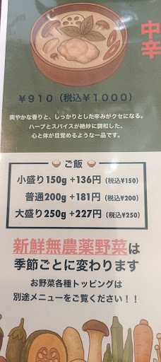 事前に入手したオープン告知チラシにはココナツカレーとの記述があったのですが入って座ったカウンターの上には相模湖カレーシーフード¥1700とのお知らせが大きく立ててあり反射的にそれを頼んでしまいました。 オープン記念とやらでトッピングが1つ無料とのことで地植えピーマンを選択。 ピーマンを地植えとそうでないので分けるメニューなんて初めて見たよ。 他にも珍しい野菜や美味しそうな野菜がトッピングメニューとして並んでいる。 お野菜へのこだわりが溢れています。