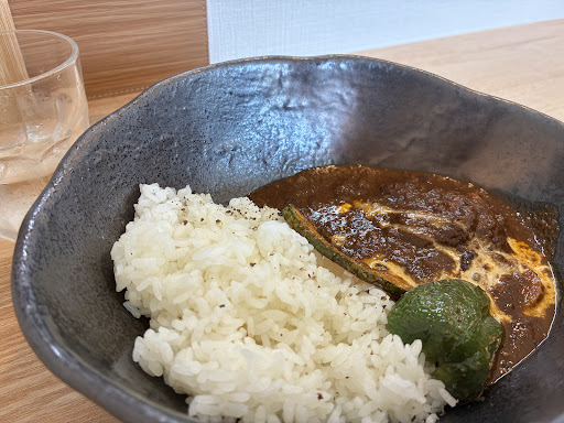 やってきたカレーは色が深くて煮込んでいる感じがありありの洋風カレー。 シーフードはエビを中心に何種か。 何かが尖るとか目立つということはなくカレーとの一体感で美味しいタイプ。 そしてこのカレーちょっと不思議な方向性においしい。 乗せ野菜以外の具材が非常に細かくなっておりなんだかわからんのですが多分きのこ。 きのこの美味しさと香りでなかなかの食べ応え。 決してお安いカレーではないが納得感ある内容。 イメージとしては高級洋食屋さんのきのこシチューのカレー転生。 きのこの香りの上品さを残したままでカレーとしての食べごたえをもたせたなかなかいいバランスのチューニング。 辛さは辛いもの好きには物足りないかと思いますがそれでもしっかりふわりぴりりとあとから辛味が来るいい塩梅でした。