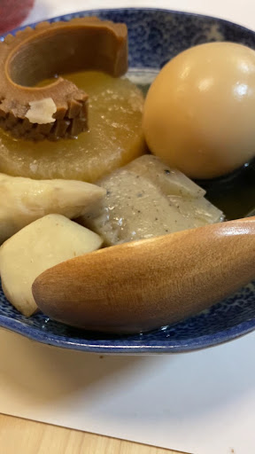 名物であるおでんは、ぜひ一度味わっていただきたい逸品です。一口食べれば、丁寧に仕込まれた出汁の奥深い旨味が口いっぱいに広がり、心まで温かくなるような感覚に包まれます。出汁は昆布や鰹節を贅沢に使い、長時間じっくりと煮込まれており、上品でまろやかな風味が特徴です。 具材も一つひとつが厳選されており、大根や卵といった定番のほか、創意工夫が感じられるオリジナルの具材も楽しめます。特に大根は、中までしっかりと出汁が染み込んでおり、柔らかくほろりと崩れる食感がたまりません。また、添えられるからしの辛味も絶妙で、全体の味わいをさらに引き立てています。