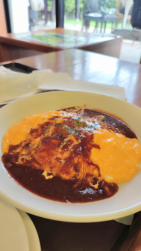 オムライスの中身は、ケチャップ味を軽くつけたバターピラフでしょうか 香りよくお米も程よい固さで美味しかったです 卵は形を保っているもののとろとろで口当たりはまろやか 1人前に何個の卵が使われているかはわかりませんが、たくさん口にほおばることができる嬉しさがありました