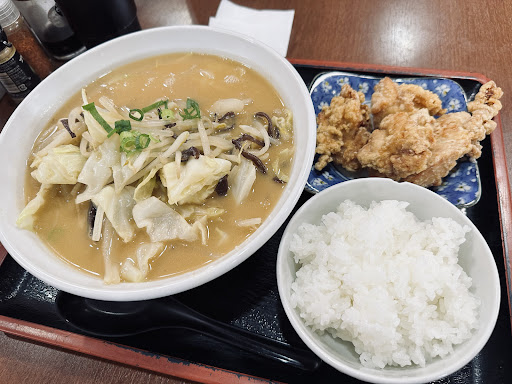 味噌ラーメンとから揚げ半チャーハンセットと決めてたのでオーダーしました。バックオーダーなかったからか、5分少々で配膳されましたー おおー、期待通りの麺顔といかにもカリッと音がしそうなから揚げです。 味噌ラーメンはキャベツ、もやし、玉ねぎ炒めが具材で熱々美味い、チャーシューも一枚肉でトロトロ、麺は自家製(奥で店主が作られてる)の少し太めのストレートでパツパツ麺で、これがスープに絡んで美味い♪...