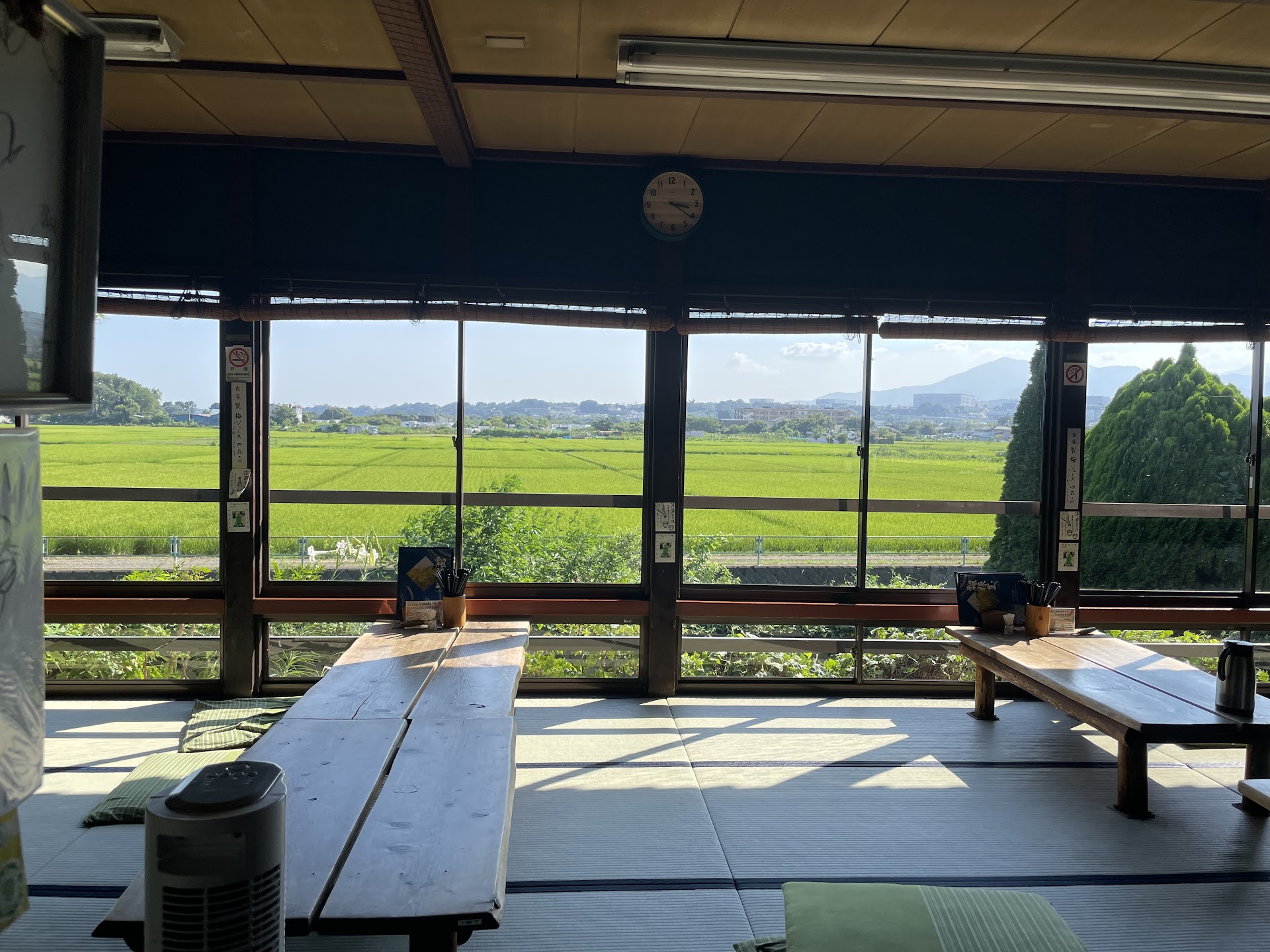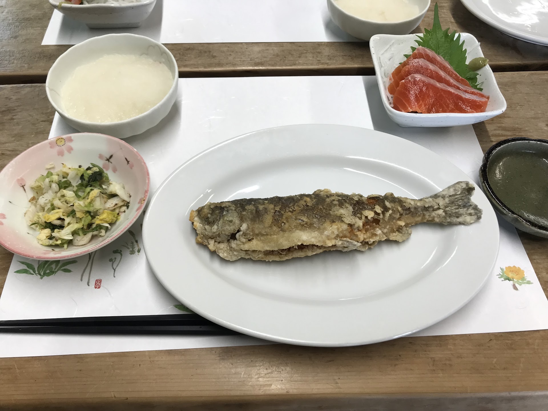 ワカサギの唐揚げ、鮎の塩焼き、麦トロ飯、麦飯、鯉の味噌汁2つ、ノンアルコールビール、メロンクリームソーダを注文。 メロンクリームソーダは先出か後出か聞かれ後出の注文。 鮎の塩焼きは時間がかかるとのこと。 店員による注文確認復唱にて待つ。