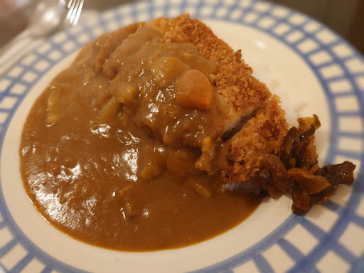 入店して待つこと10分でカツカレー(税込1,100円)はやって来た。カツの肉はロースで仕上り肉厚は5ミリほど。カツとライスとカレーをいっぺんに頬張るには丁度よい厚みだ。洋食屋さんと言う事もあり、カレー自体の味付けは抑制的で、ほんのり甘さが感じられて美味しかった。もしもう少し刺激が欲しい方は、卓上のウスターソースを少し垂らすことをお勧めします。