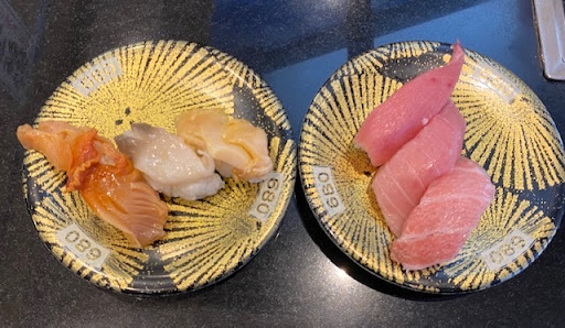本まぐろ〜は熟成、中とろ、大とろ3品。 はっきりそれぞれの味、美味しさが判り美味し♫ よく大とろ他店で頼むと、中とろの方が美味しかったり。 その中とろも、びんとろの方が美味しかったじゃんなんて日もある。 独楽寿司さんは2回目だが、そのハズレは今のところ無い。