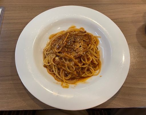 さて何食べようか悩んでたら。 PIZZA SETがある。 ゲッティかサイドメニュー2品何れかにサラダ+スープ+ドリンクバー付き。 吾輩 ミートソース 愛方 青菜とベーコンのペペロンチーノ マルゲリータ1枚オーダー