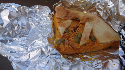 この日はカボチャのキッシュ(ホールの半分、4カット分)とフロフトブロート(ドライフルーツの入ったパン)まるっと一本を買いました。 おなかがすいていたので、キッシュは帰り道に食べてしまいましたが、 カボチャの風味はしっかり残しつつ、カボチャの種やベーコンチップなどが入っていて、食べごたえがありました。 ブロートはレーズンなどのドライフルーツに胡桃やひまわりの種が入ってました。 硬いけど、ずっしりとして食べごたえがあり、めっちゃおいしかったです。 次の日には一本完食(笑)