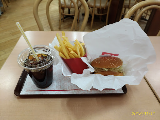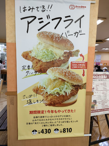 Read more新メニューは戦隊バーガー(ゴレンジャーモチーフ)って、と思ったけどボリュームがあって凄くおいしかったです。ドムドムバーガーのこういうところが癖になります。 新メニューは親子丼バーガーでした。想像以上においしかったです。それとサイドメニューにかりんとう饅頭が追加されていました。揚げたての熱々ホクホクと、冷めても外はパリパリ中はしっとりと、2個以上買って両方を楽しむことをお勧めします。以下は今までの口コミです。 今度はイカデビルバーガーです。黒いバンズに濃い目の味付けイカの唐揚げと激辛デビルソース、とても美味しかったです。癖になりそう、期間限定なのでお早めに。以下は今までの口コミです。 まるごと一匹カニバーガー、年に1回か2回不定期開催、期間限定、数量限定、やっと食べることができました。値段は高めですがとても美味しかったです。以下は今までの口コミです。 久しぶりによってみると、なんと新メニューに餃子バーガーなるものが。興味本位で購入すると、中華料理の餃子のイメージとは違いパリパリ揚げ餃子と卵焼きとチーズがボリューミーだけど黒酢でサッパリ、とても美味しかったです。ドムドムバーガー、好きだな〜。以下は前の口コミです。 買い物ついでに寄りました。またまた期間限定の【味噌カツバーガー】が新発売。早速購入してみると肉厚ボリューム満点でゴボウもいい感じ。期間限定はもったいない。次のドムドムの新メニューも楽しみです。以下は前の口コミです。 期間限定のアジフライバーガー、ボリューム満点でタルタルソースとアジフライが抜群の相性です。駐車場のチケットも精算してくれるので、アジフライバーガーを目当てにドムドムバーガーに来店しても損しません。ただ時間帯によっては混んでい...