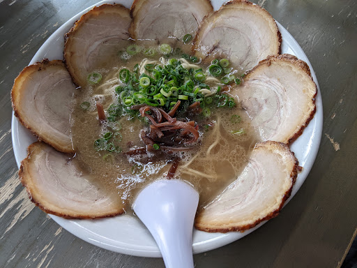 Read more若松にある老舗のラーメン屋博多一番さんにラーメンを食べに行って来ました! 博多の豚骨ラーメンは、最近食べていなかったので非常に楽しみです!お店に着いたのが15時半で先客の家族連れ3名が店を後にしています!お店に入店すると豚骨の野趣溢れる臭いがお出迎え!カウンター席を目指して歩くと床も脂でツルツルしているので慎重にカウンター席を目指し着席です!席に腰をかけてメニューから博多ラーメンの脂コッテリ、麺硬め(680円)を注文!替え玉をする事を考えて脂は、コッテリに注文し食べる準備は、完了です!博多一番さんの店内は、カウンター席とテーブル席があり、席数も豊富で混雑しても余裕があります!また駐車場が無いので車で来店される方は、近くのコインパーキングに車を駐車して下さい!テレビのドラマを観ながら、待つ事5分程で博多ラーメン脂コッテリ、麺硬めが出来上がりました!見た目は、シンプルな博多ラーメンでチャーシュー2枚とキクラゲの刻み、そして万能ネギの微塵切りが具材として使用されています!早速、細麺ストレートを勢い良くズルズル啜ると瞬く間に完食!食べている途中に替え玉(110円)硬めを注文し、辛子高菜を添えて啜りまくり!辛子高菜は、以外と多く入れても辛さが控えめなので、スープの味が変わらないので安心して利用出来ます!最後に替え玉硬めを再度注文して、酸味の強い紅生姜と共に食べれば完食です!やはりコッテリ感が強いスープには、紅生姜が活躍してくれて、お陰で最後は、サッパリと食べれました!スープは、少し豚骨の味が弱いのが印象的で、豚骨の臭みを感じてしまうスープなので臭いに敏感な方には、キツイかもしれませんね!また薄いチャーシューも肉の旨味を感じなかった部分は、本当に残念に思えます!食べ終わり会計を済ませて、替え玉割引券を貰い店を後にしました!総評的に申せば、普通に美味しい博多ラーメンで、豚骨の臭いが好きな方には、最高のお店だと思えます(笑)取り敢えずは、久方ぶりの九州の味を堪能出来て満足と言う事で締めさせて頂きます!皆様も博多一番さんで思い思いのトッピングで、博多のラーメンを楽しんで下さいね!!それでは、博多一番の博多ラーメンに感謝を込め...