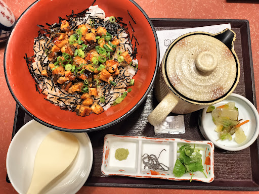 炙りうなまぶし丼をオーダー。 着丼すると、メニュー写真より鰻は炙りが弱いくて油がくどいし、カットサイズが小さく(5mm角くらい)で、余り部位を使っているのかと勘ぐるくらい(^_^;)