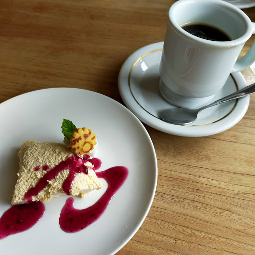 食事は、私はライスとチキンのデザートセットを頼みました。美味しかったです♪チキンがとても柔らかかったです。ムース?ババロア?のようなデザートも美味しかったです。 珈琲は好みがあるかと思いますが、私的には少し薄いかな…と思いました。