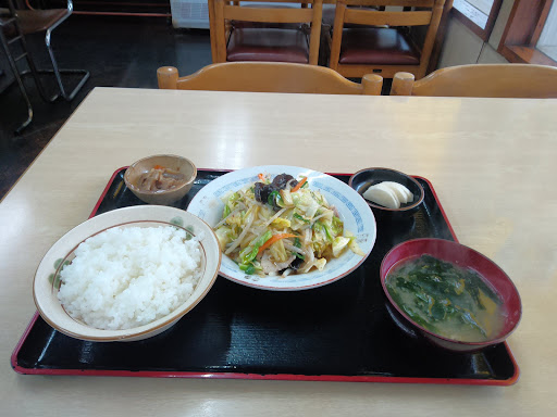 竹で作られた壁のメニューを眺めると 定食は カツ、焼肉、焼き魚、野菜炒め、モツ煮込み 丼ものは カツ丼、カツカレー、カレーライスと続き ラーメン系のラインナップが並ぶ 一昨日は 蕎麦にモツ煮、昨日は煮カツ定食 だったので 今日は一番 身体に良さげな 野菜炒め定食¥750 にしてみましょう。